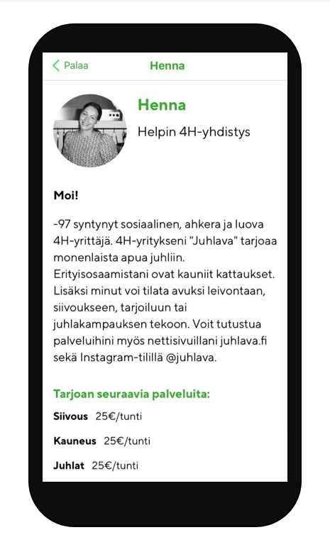 - Helpin kautta palveluasi myydään 4H-yhdistyksen hinnaston mukaan ja 4H-yrittäjänä sinulle maksetaan 80% omasta asiakaslaskutushinnastasi.