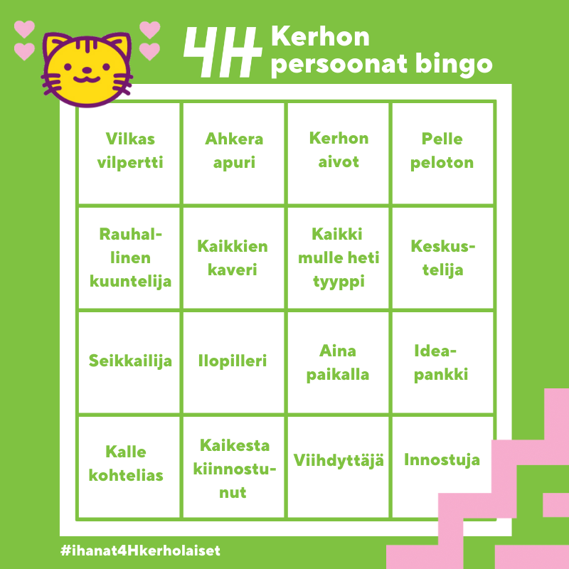Tee omasta kerhostasi kerhon persoonat -bingo. Yritä saada täysi rivi kulmasta kulmaan, vaaka- tai pystysuunnassa. Kuinka monta erilaista tyyppiä löysit? Saitko bingon?