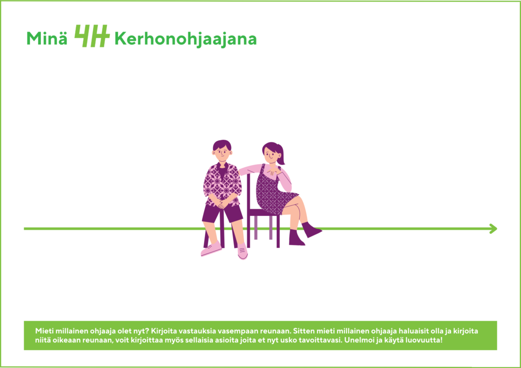 - Kuvaile viivan loppuun tulevaisuutta: Millainen kerhonohjaaja haluaisit olla? Haluaisitko olisitko rohkeampi esiintyjä? Uskaltaisitko heittäytyä enemmän? Olisitko ahkerampi suunnittelija?
