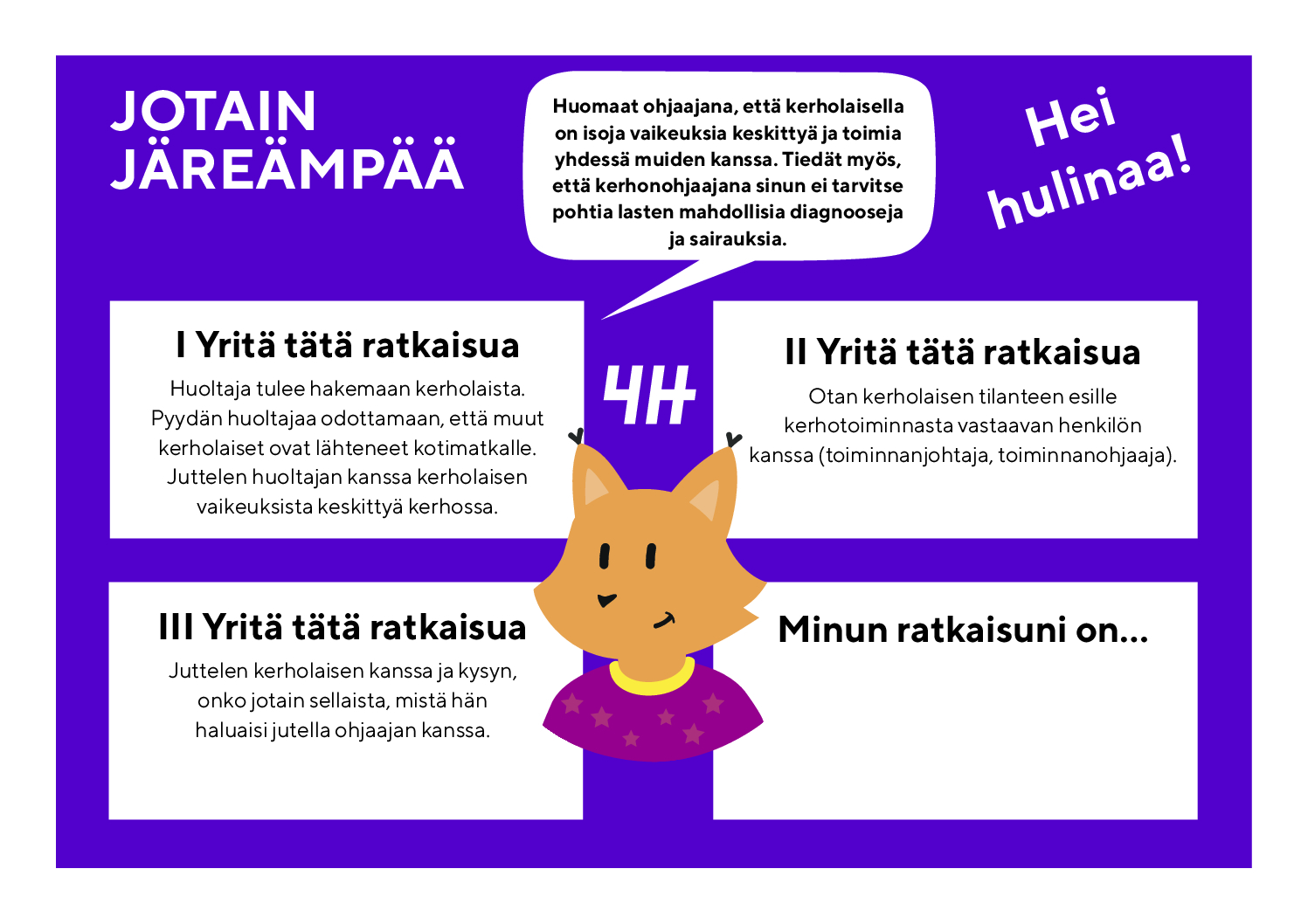 Toisinaan hyvät välineet hulinatilanteiden rauhoittamiseen ovat paikallaan. Tila saattaa olla liian pieni, ja se aiheuttaa hämminkiä. Jotakuta kiusataan. Hiljaiset ja kiltit lapset pitäisi saada mukaan. Oman kerhon vastuuohjaajalta tai yhdistyksen toiminnanjohtajalta saat tukea ja neuvoa erilaisissa tilanteissa toimimiseen ja erilaisten välineiden käyttöön.